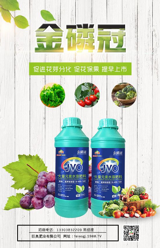 巨奧肥業(yè)有限公司【大量元素水溶肥料0-480-160-金磷冠】有效促進(jìn)光合作用和增加樹體的養(yǎng)分積累,促進(jìn)葡萄花芽分化,提高葡萄開花座果,提早上市,提高經(jīng)濟(jì)效益。
