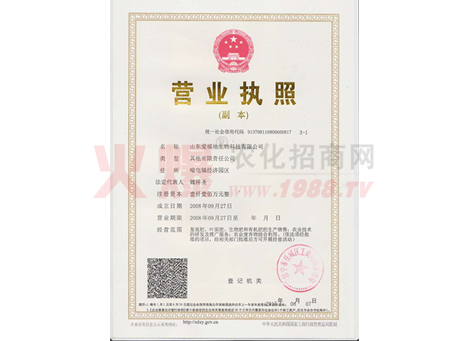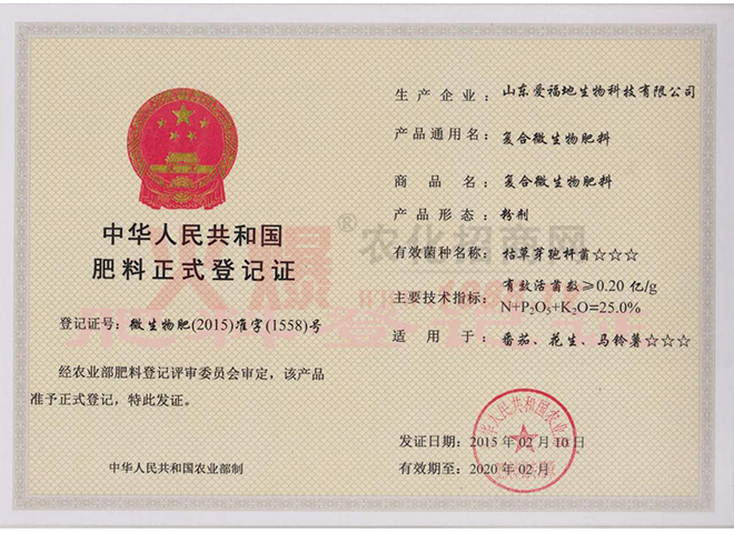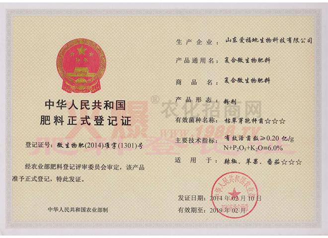 證書名稱:肥料正式登記證 發(fā)證機構:中華人民共和國農業(yè)部