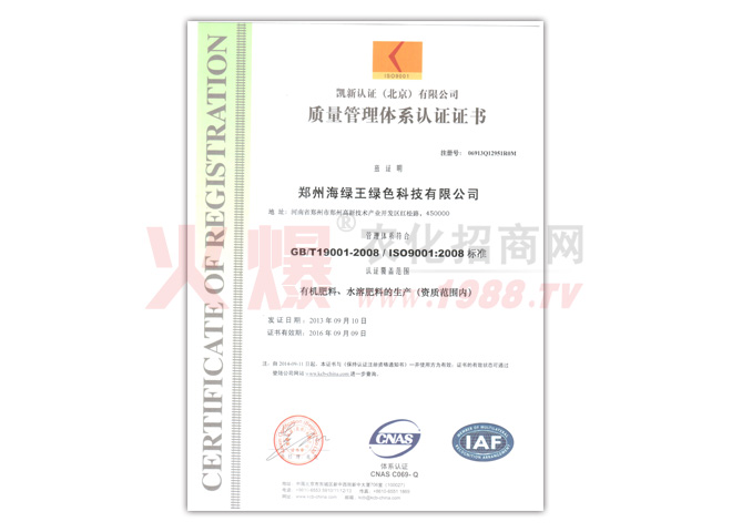 如今的海綠王,各個部門及各項規(guī)章制度均以完善,產(chǎn)品的生產(chǎn)也步入了規(guī)范化管理,起步雖晚,但成績喜人,海綠王被評為“中央電視臺AAA誠信企業(yè)”“河南衛(wèi)視《梨園春》欄目上榜品牌”、“3/15消費者信得過單位”“河南省肥料協(xié)會常務理事單位”、“河南省十佳科技型具競爭力企業(yè)”、“ISO9001質量認證”、“2012綠色農(nóng)資品牌”、“中國果菜無公害科技示范單位”、“世界貿(mào)易組織河南省推薦單位”、“2009中國農(nóng)藥企業(yè)具成長性100強”、“河南民營企業(yè)發(fā)展促進會常務理事單位、”河南科技學院大學生就業(yè)創(chuàng)業(yè)見習基地“等數(shù)項榮譽。目前的海綠王,穩(wěn)步發(fā)展,勇于創(chuàng)新,走出了具有海綠王特色的綠色農(nóng)業(yè)發(fā)展之路,力爭為中國綠色農(nóng)業(yè)、中國新農(nóng)村的建設與發(fā)展貢獻自己的力量。