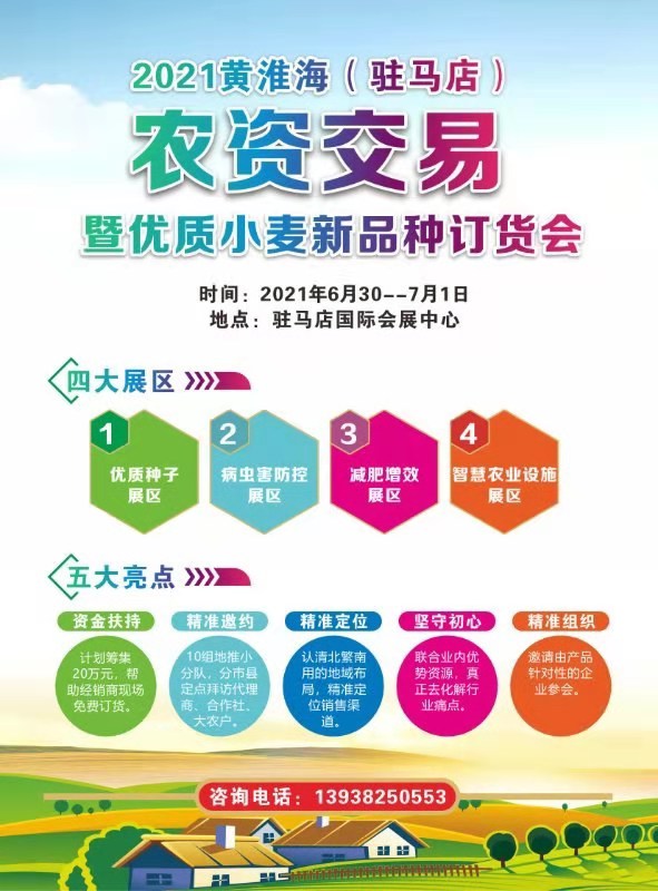 為促進(jìn)我省小麥種子北繁南用,加快我省花生品種推廣、普及高效綠色防控成果,促進(jìn)一二三產(chǎn)業(yè)融合發(fā)展,提升我省農(nóng)業(yè)品牌。2021黃淮海(駐馬店)農(nóng)資交易暨優(yōu)質(zhì)小麥品種展覽會、2021第二屆河南花生產(chǎn)業(yè)信息交流暨品牌農(nóng)資農(nóng)機(jī)展覽會將于6月29日到7月1日在駐馬店國際會展中心舉辦。